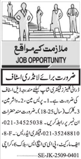 - Dry Cleaners Factory Shop: Recruiting motivated pressmen, washermen, and a clerk.