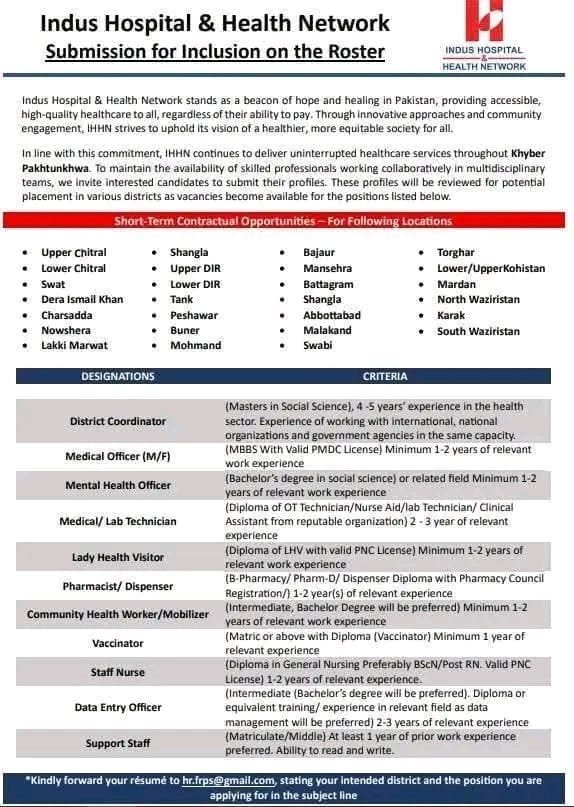 Interested and qualified candidates are strongly encouraged to submit their profiles for these invaluable short-term contractual opportunities. To apply, kindly forward your résumé to hr.frps@gmail.com. It is crucial to clearly state your intended district and the specific position you are applying for in the subject line of your email. This direct and organized application process ensures that your profile is efficiently reviewed for potential placement in these vital roles, contributing directly to IHHN's mission of providing accessible, high-quality healthcare across Khyber Pakhtunkhwa.
