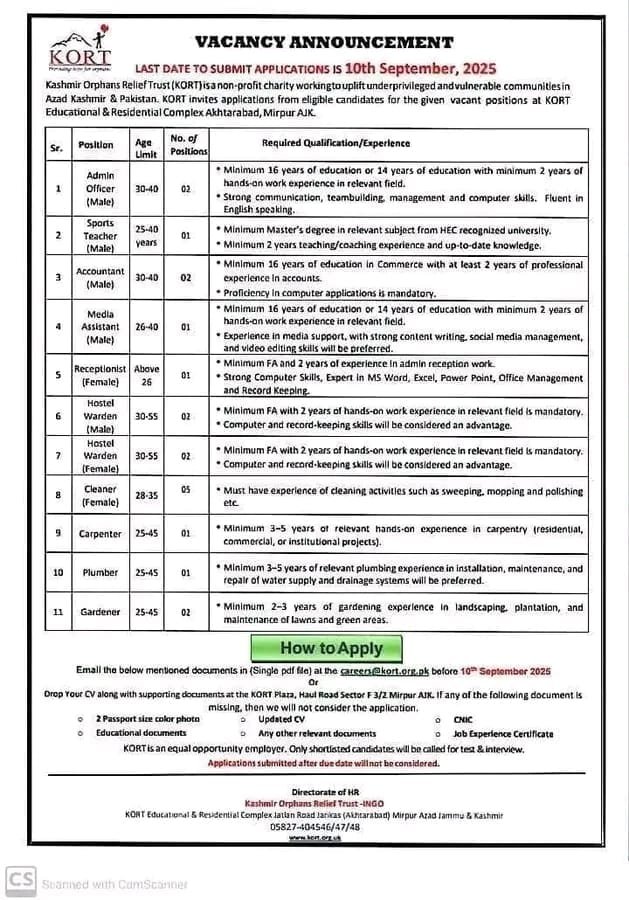 These varied positions at KORT's Educational & Residential Complex in Mirpur AJK offer more than just employment; they provide a pathway to make a meaningful difference in the lives of vulnerable communities. With a range of roles from administration and education to skilled trades, KORT is seeking dedicated individuals who share their vision for upliftment and support. Don't miss this opportunity to contribute to a noble cause – ensure your complete application is submitted by the strict deadline of September 10, 2025, and take the first step towards a truly rewarding career with the Kashmir Orphans Relief Trust.