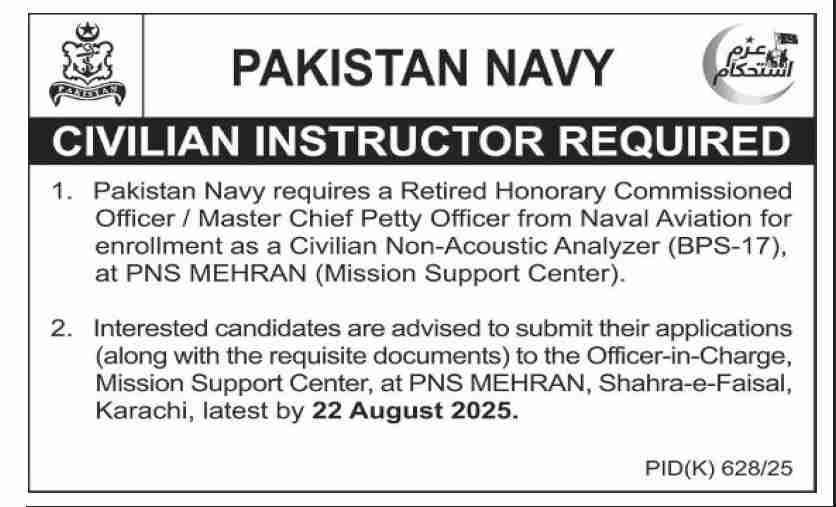 Pakistan Navy Jobs 2025 ,Pakistan Navy requires a retired Naval Aviation Officer/MCPO as a Civilian Non-Acoustic Analyzer (BPS-17) in Karachi. Apply by August 22, 2025.